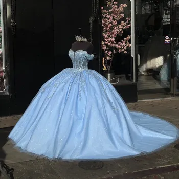 قبالة الكتف فساتين عيد ميلاد Quinceanera بريق الترتر الطرف الديكور الحلو 16 Vestidos De 15 أنوس السماء الزرقاء العباءات MQD8