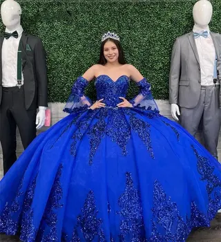 Cap manga fuera del hombro cumpleaños Quinceañera Vestidos brillo lentejuelas rebordear fiesta dulce 16 Vestidos De 15 Anos Vestidos MQD2