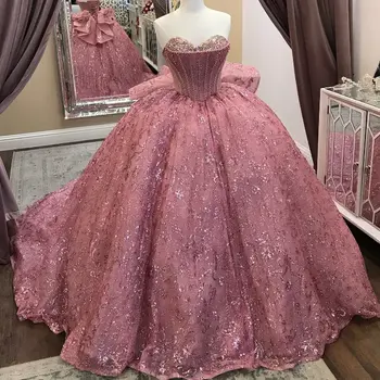 כדור גיבן את הכתף תחרה חרוז מתוק 16 שמלה vestiddos דה 15 פחיות quinincera מבריק ורוד quinincera שמלות mq626
