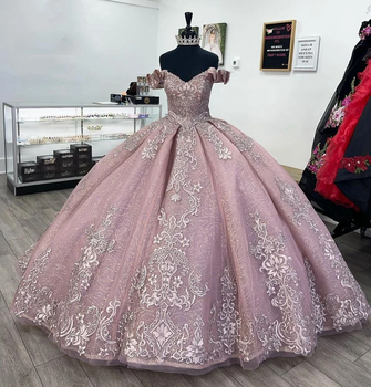 ブラッシュピンクキラキラボールガウンオフショルダーVestedo De 15 Anosスウィート16プロムプリンセスプラスパーティー誕生日キンセアネラドレスMQ682