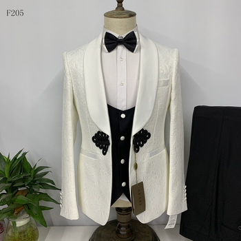 リアルホワイトスリムフィットメンズスーツ3ピース3Dプリント上げドラゴンパターン2スリットビジネスパーティーウェディングスーツ男性用MSW2