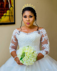Moriliホワイトカスタマイズアップリケビーズレースふっくらアフリカンボールガウン安いウェディングガウンMWA487