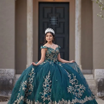 Omuz kapalı doğum günü quincedresses elbiseler Glitter 3D çiçekler parti tatlı 16 Vestidos De 15 Anos koyu yeşil önlük MQD14