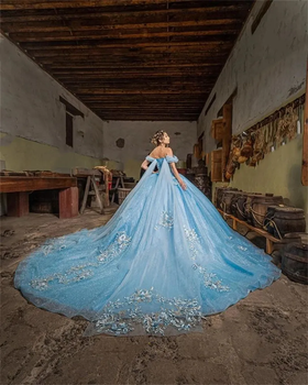 Tulle 3D Hoa Tắt Vai Sinh Nhật Khiêu Vũ Đảng Ngọt Ngào 16 Ăn Mặc Vestido De 15 Bầu Trời Màu Xanh Quinceanera Dresses Mq646