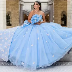 Spaghetti dây đeo sinh nhật quinceanera Dresses long lanh 3D bướm ren bên ngọt ngào 16 vestidos de 15 Anos bầu trời màu xanh gowns mqd17