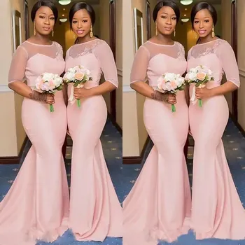 Morili Nửa tay áo appliqued pinklace thanh lịch Châu Phi Maid Of Honor Nàng tiên cá dài Phù Dâu Váy mbl12